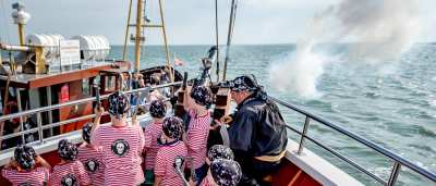 Die Hilfspiraten werden noch an Land vom Piratenkapitän eingekleidet und mit Säbel ausgestattet. Anschließend wird das Schiff geentert und die „Jolly Roger“-Fahne gehisst. Nun kann das Abenteuer an Bord des Kutters. Auf großer Fahrt entspinnt sich mit Hilfe der Crew und jeder Menge Seemannsgarn ein herrliches Piratenspektakel mit Piratenmutproben, Meuterei, Gefangenen, Schatzsuche und einem zünftigen Bordschluck. Zum Abschluss lassen wir es noch mal richtig aus unserer Kanone knallen. Auch die „Verwachsenen“ sind herzlich willkommen und müssen – ob sie wollen oder nicht – mitspielen!