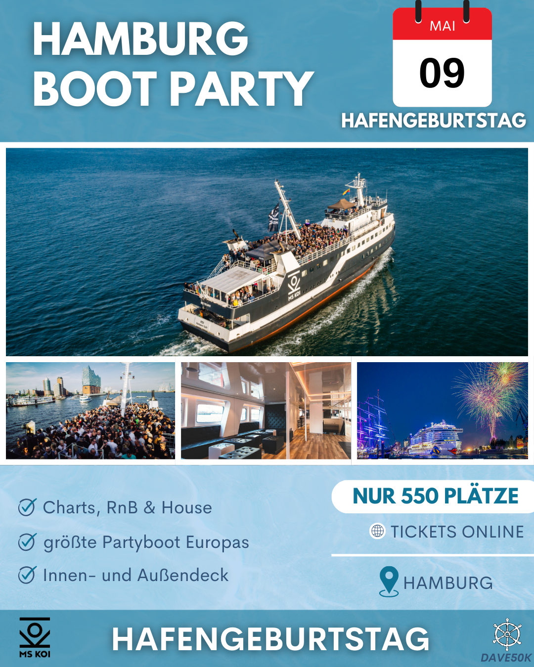 Der Hamburger Hafen feiert in diesem Jahr seinen 835. Geburtstag – und das möchten wir gebührend zelebrieren! Das viertägige Fest in Hamburg beginnt mit einer eindrucksvollen Einlaufparade am Donnerstag und endet mit einer beeindruckenden Auslaufparade am Sonntag. Während dieser Zeit erstreckt sich das Festgeschehen von der historischen Speicherstadt bis zum lebendigen St. Pauli, mit zahlreichen Live-Bühnen und vielfältigen Veranstaltungsorten.