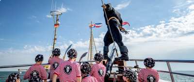 Die Hilfspiraten werden noch an Land vom Piratenkapitän eingekleidet und mit Säbel ausgestattet. Anschließend wird das Schiff geentert und die „Jolly Roger“-Fahne gehisst. Nun kann das Abenteuer an Bord starten. Auf großer Fahrt entspinnt sich mit Hilfe der Crew und jeder Menge Seemannsgarn ein herrliches Piratenspektakel mit Piratenmutproben, Meuterei, Gefangenen, Schatzsuche und einem zünftigen Bordschluck. Zum Abschluss lassen wir es noch mal richtig aus unserer Kanone knallen. Auch die „Verwachsenen“ sind herzlich willkommen und müssen – ob sie wollen oder nicht – mitspielen!